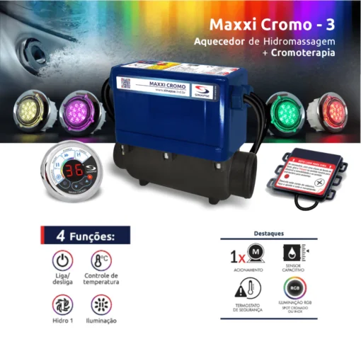 O Maxxi Cromo é um aquecedor potente, desenvolvido para aquecimento rápido e acionamento da bomba de circulação e sem perder a vazão dos jatos de hidromassagem de banheiras alem de trabalhar a cromoterapia.