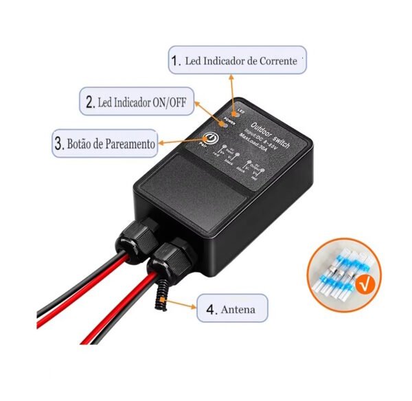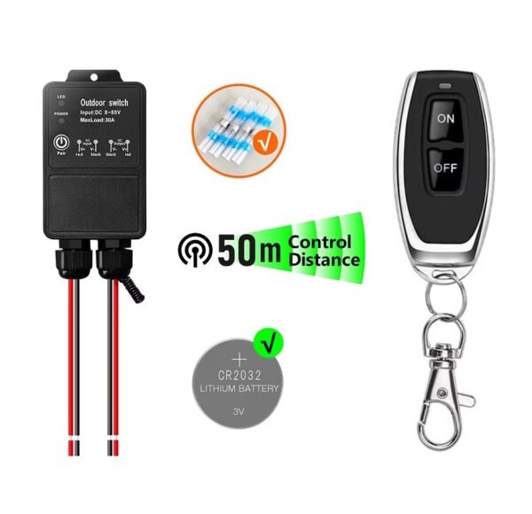 Acionador remoto por controle de Lampadas, ventiladores e bombas 12v/24v. Suporta até 30A, com alcance de até 80m em campo aberto. Inclui receptor, controles remotos e manual.