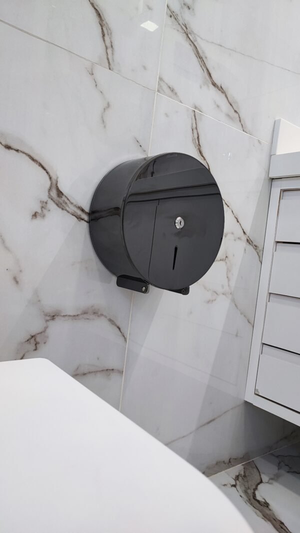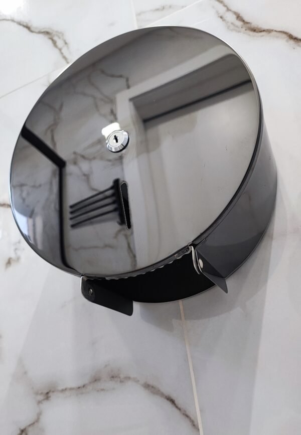 Suporte para papel higiênico de banheiro em rolo em aço Inox com acabamento preto polido. Com visor e Chave.