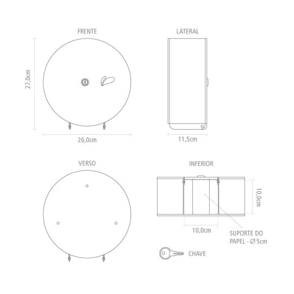 Elegante e resistente, este dispenser é ideal para banheiros comerciais e corporativos. Possui visor para controle de reposição e chave de segurança.