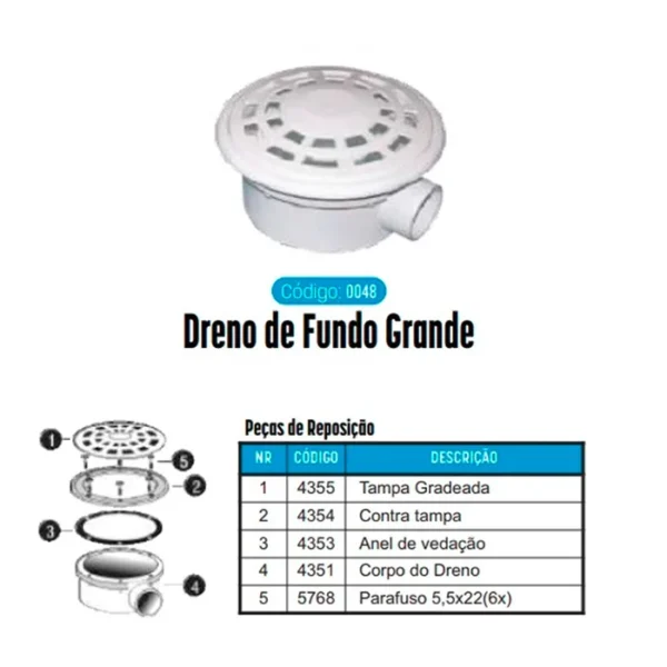 Kit completo do dreno de fundo para piscinas da marca Hidrasul. Inclui: Tampa grelhada + Contra-tampa + Anel de Vedação. Verifique a medida antes de comprar: Diâmetro de 16,5 cm (165 mm). Peça de reposição em ABS. Atenção: não acompanha os parafusos.