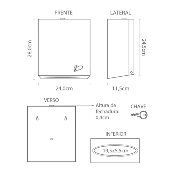 Sofisticação e praticidade para seu ambiente! Fabricado em aço inox 430 polido, oferece alta durabilidade, resistência à corrosão e fácil limpeza. Com visor para controle de papel e chave de segurança, é ideal para banheiros comerciais.